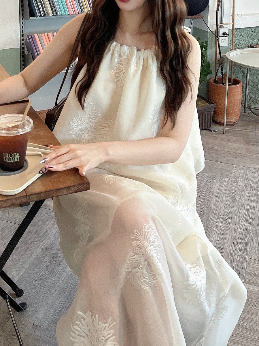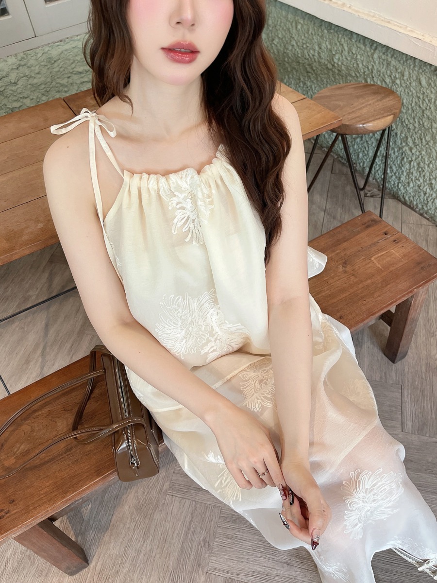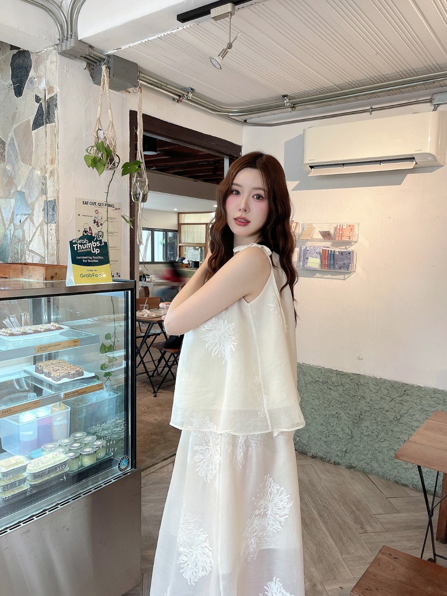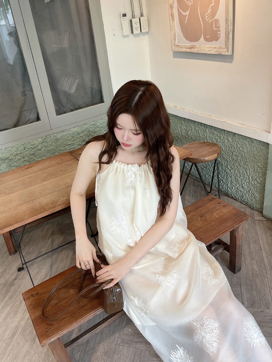 ชุดเซ็ทผ้าไหมชีฟองปักเสื้อสายเดี่ยวผูกโบว์ไหล่ และกระโปรงยาว