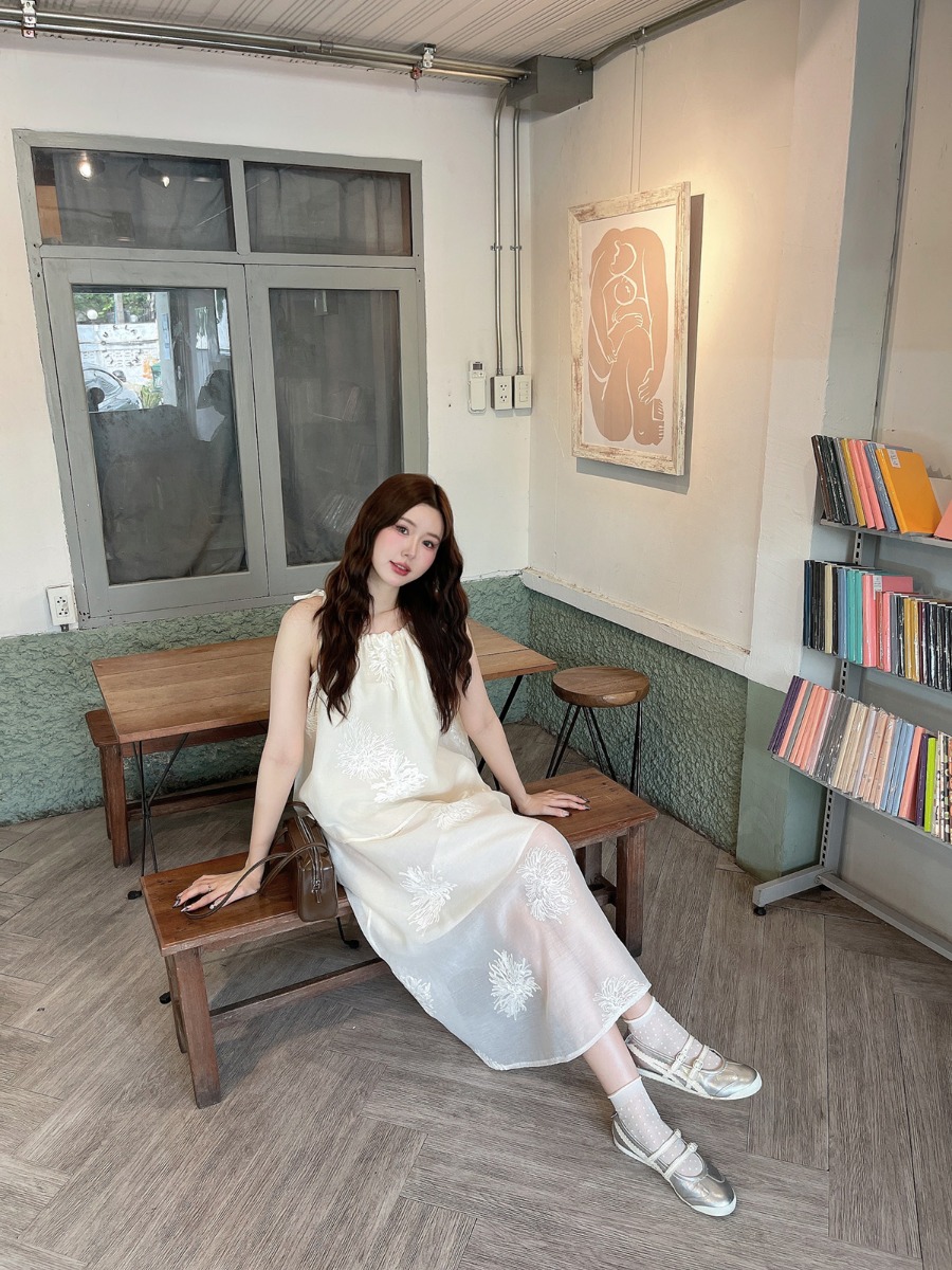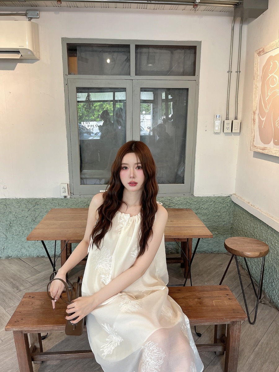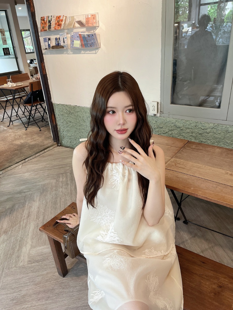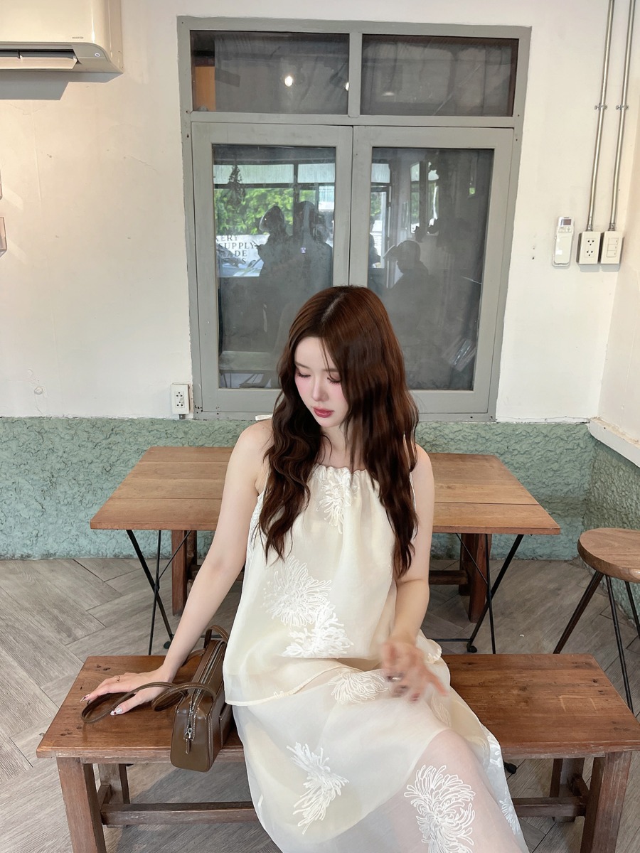 ชุดเซ็ทผ้าไหมชีฟองปักเสื้อสายเดี่ยวผูกโบว์ไหล่ และกระโปรงยาว