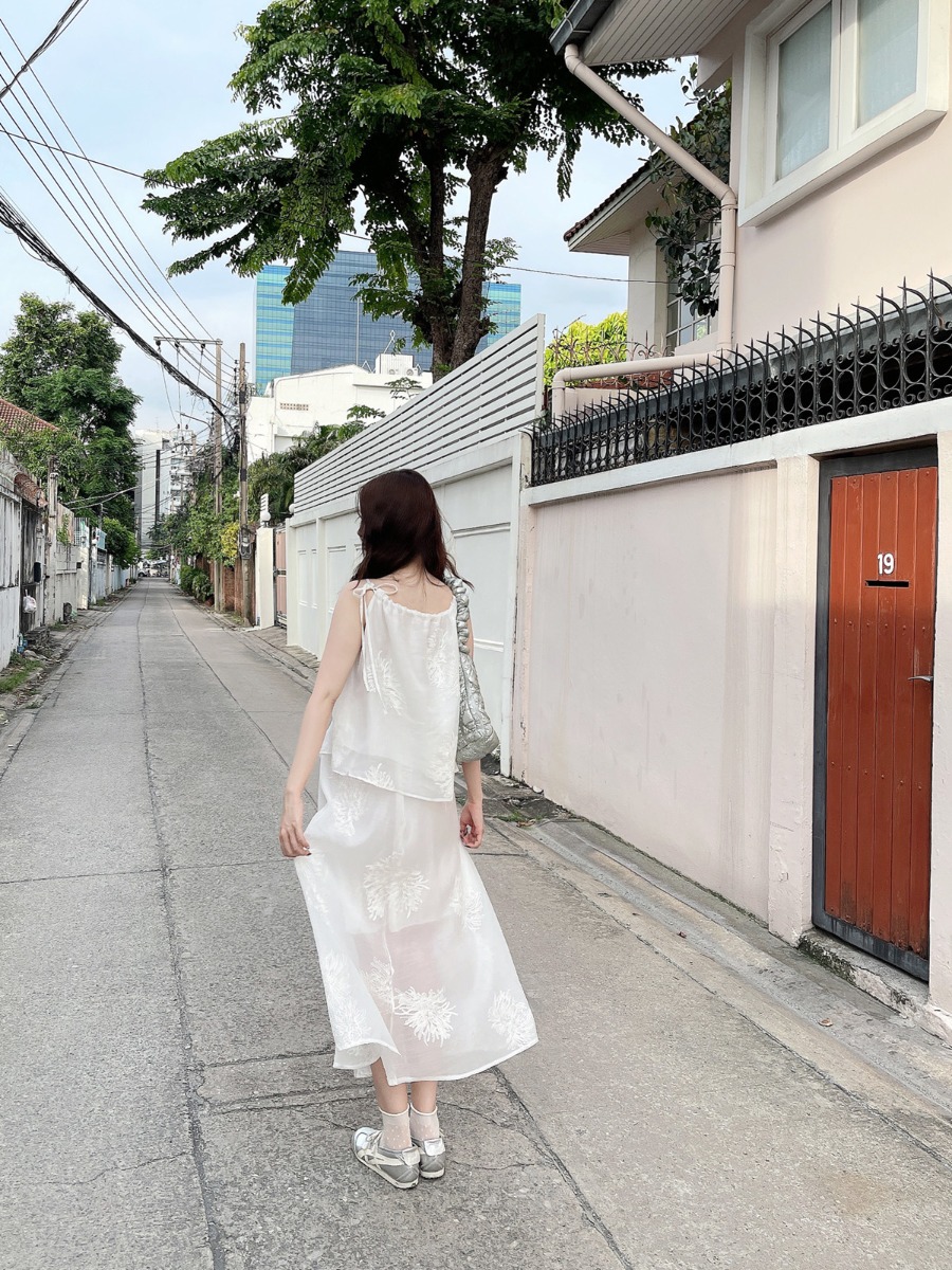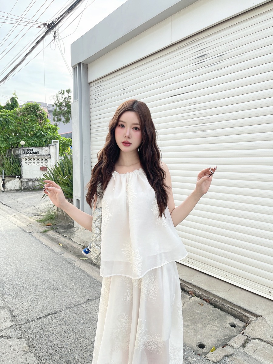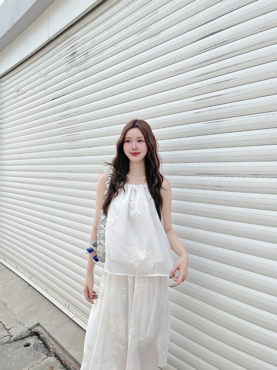 ชุดเซ็ทผ้าไหมชีฟองปักเสื้อสายเดี่ยวผูกโบว์ไหล่ และกระโปรงยาว