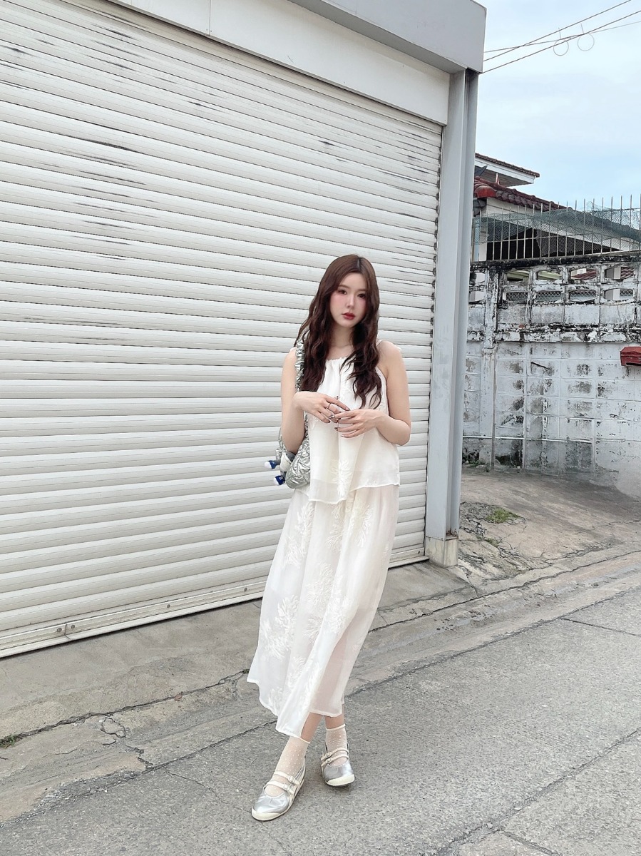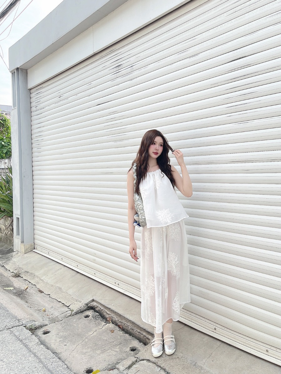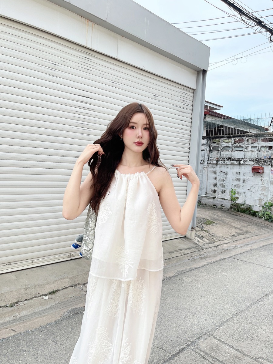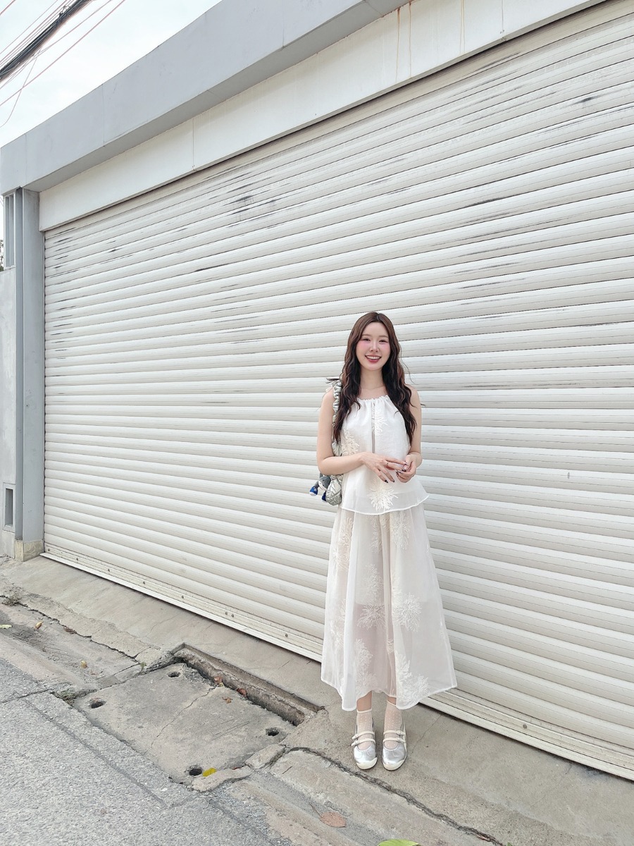 ชุดเซ็ทผ้าไหมชีฟองปักเสื้อสายเดี่ยวผูกโบว์ไหล่ และกระโปรงยาว