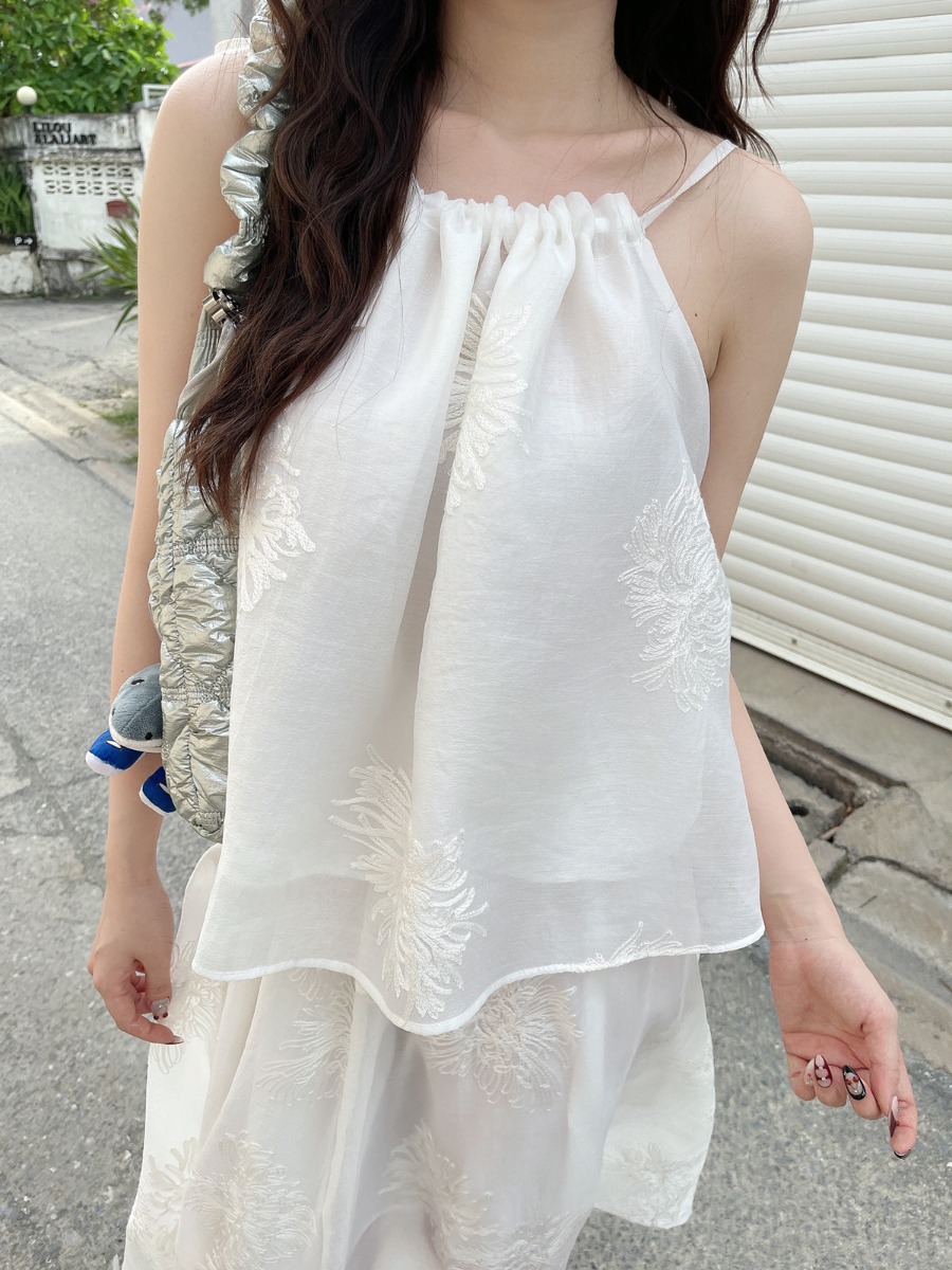 ชุดเซทผ้าไหมชีฟองปักเสื้อสายเดี่ยวผูกโบว์และกระโปรงยาว