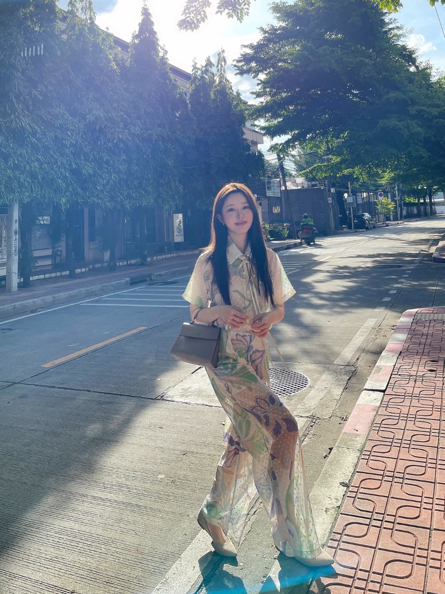 เนื้อผ้า : ผ้าชีฟองพิมพ์ลาย เนื้อนุ่มลื่น บางเบา ทิ้งตัว
